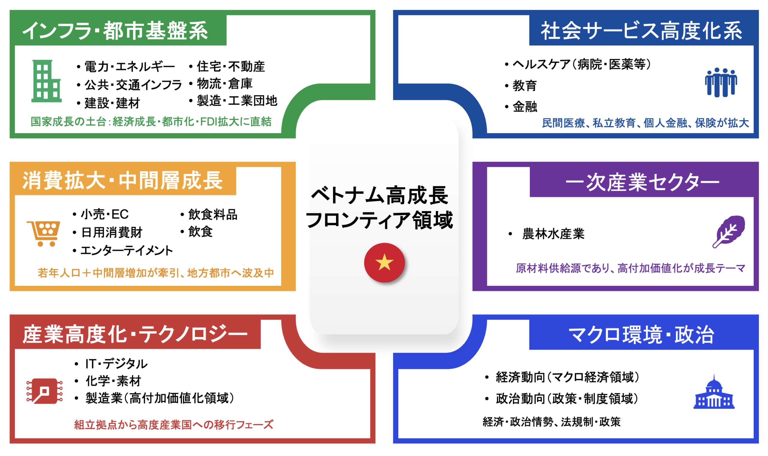 InfoBankは、日本企業にとってビジネス機会が多いベトナムの社会インフラ、消費拡大、産業の高度化、社会サービス、一次産業、マクロ経済まで、ベトナム経済の成長を支える主要分野を横断的に扱っています。