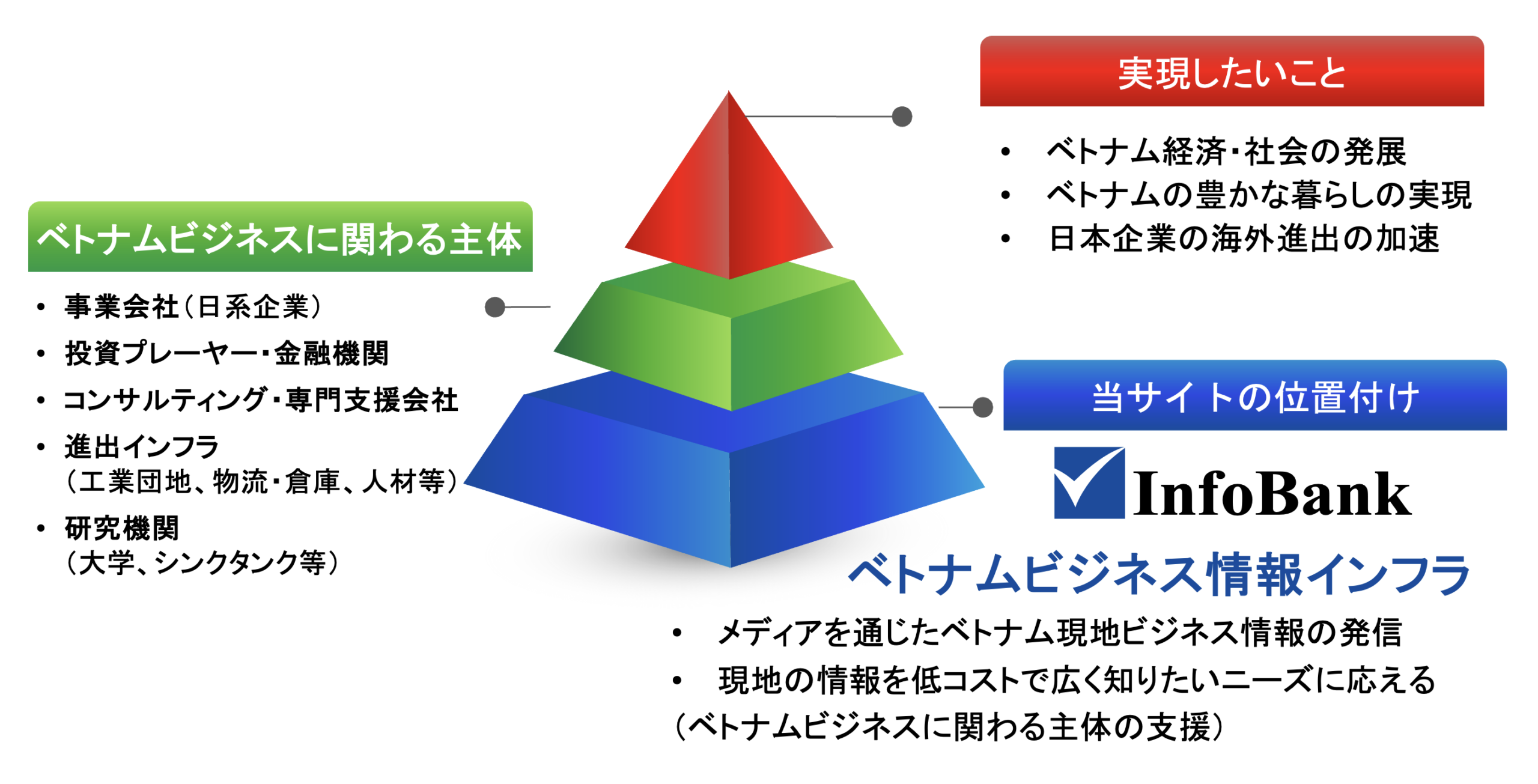 InfoBankは日本企業によるベトナムビジネスの挑戦と成長を支える情報基盤を構築し、ベトナム社会と経済の発展ならびに日本企業の海外進出の加速に貢献します。