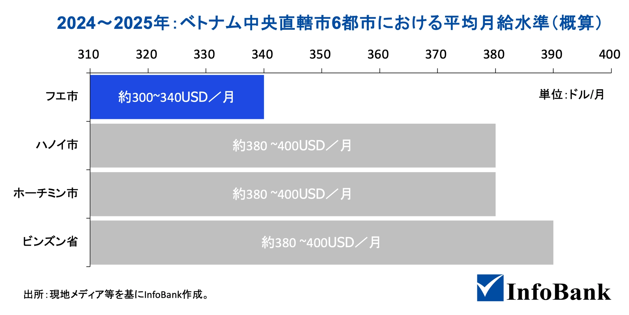 2024〜2025年時点のフエ市の平均月給は、おおむね300〜340ドル程度と推計され、ハノイ市(約380〜400ドル)、ホーチミン市(約380〜400ドル)、ビンズオン省(約380〜400ドル)といった主要製造拠点よりも低い水準にある。 このため、人件費面では一定のコスト競争力を有しているといえる。