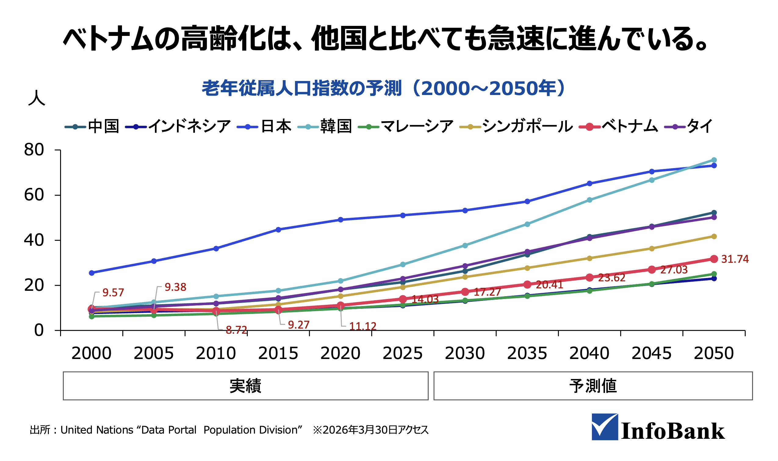 しかし2010年を底に上昇へ転じ、2020年には11.12、2025年には14.03と加速が始まっている。2050年には31.74に達し、わずか25年で約2.3倍に跳ね上がる見通しだ。この高齢化スピードはインドネシアやマレーシアを上回り、タイに近い軌道をたどっている。
