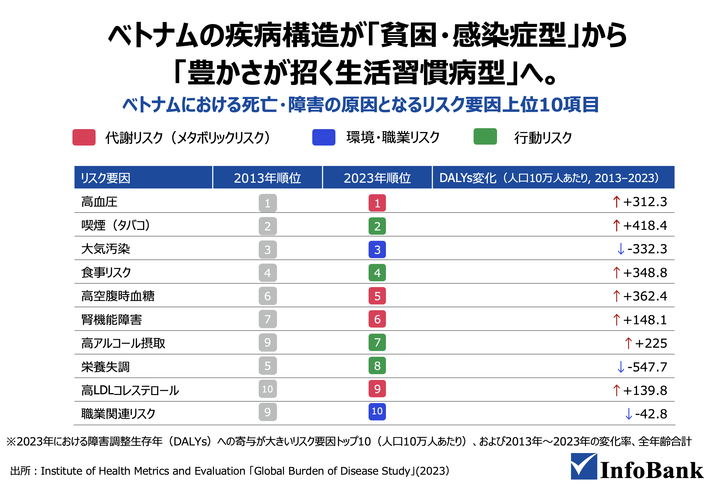 ベトナムの疾病構造は、この10年で大きく変わった。2013年と2023年の死亡・障害リスク要因上位10項目を比較すると、かつて上位にあった栄養失調や大気汚染のDALYs(障害調整生存年:病気や障害、早死によって失われた健康的な生活年数を表す指標)が大幅に減少した一方で、高血圧、喫煙、高空腹時血糖、食事リスクといった代謝・行動リスクが軒並み急増している。加えて、腎機能障害や高LDLコレステロールも順位を上げており、生活習慣に起因するリスクの広がりが見て取れる。
