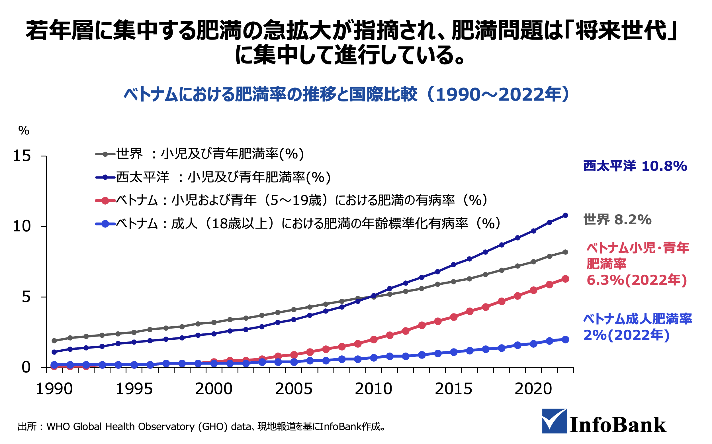 生活習慣病の広がりは、大人だけの問題ではない。WHOの統計によれば、ベトナムの小児・青年(5〜19歳)の肥満率は1990年にはほぼゼロだったが、2022年には6.3%まで急上昇している。