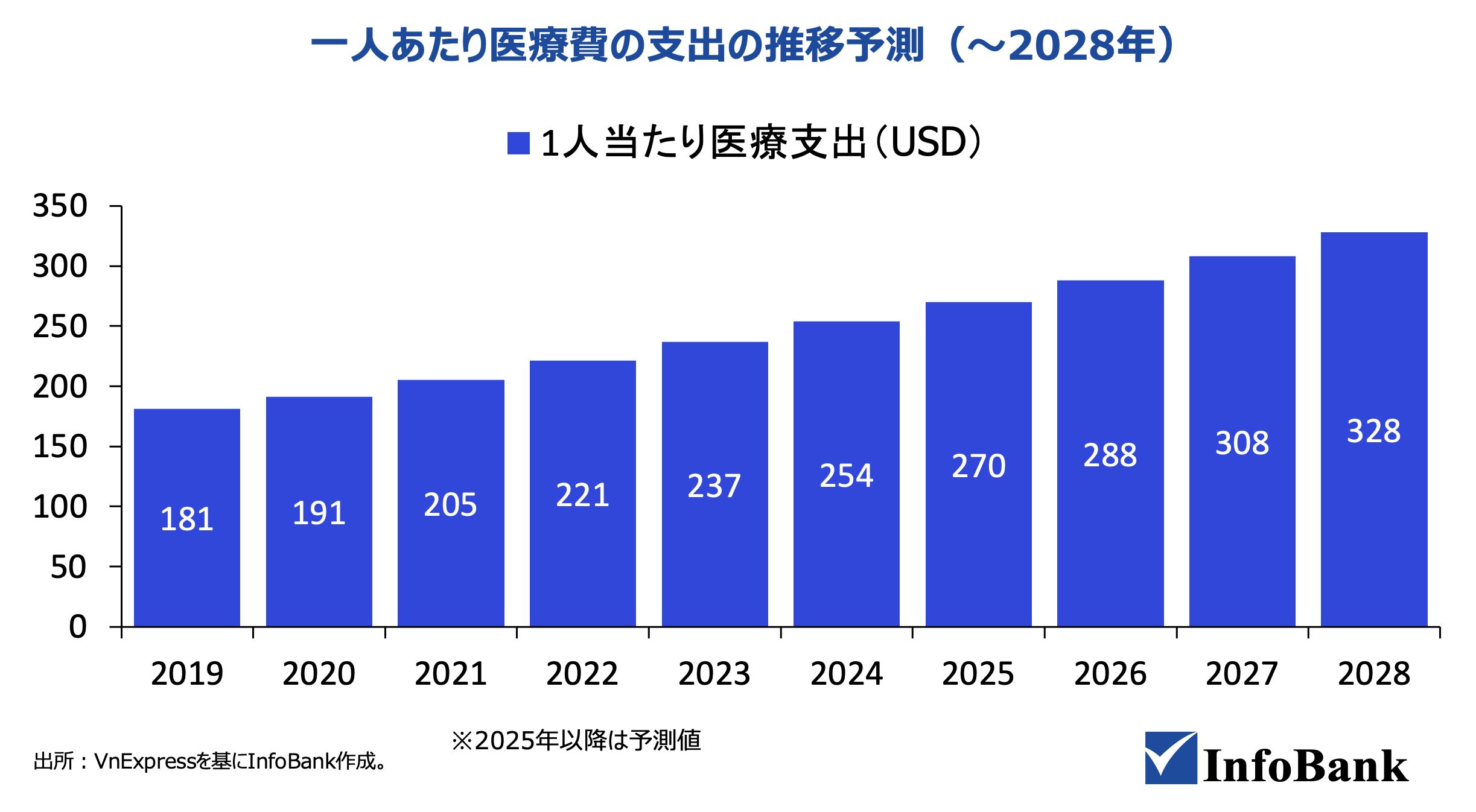 こうした医療需要の拡大は、当然ながら医療費の膨張にも直結している。現地報道によれば、ベトナムの1人あたり医療費は2019年の181ドルから年々増加を続け、2028年には328ドルに達する見通しだ。国全体の医療費も2019年の174億ドルから2028年には341億ドルへと、わずか10年足らずでほぼ倍増が見込まれている。