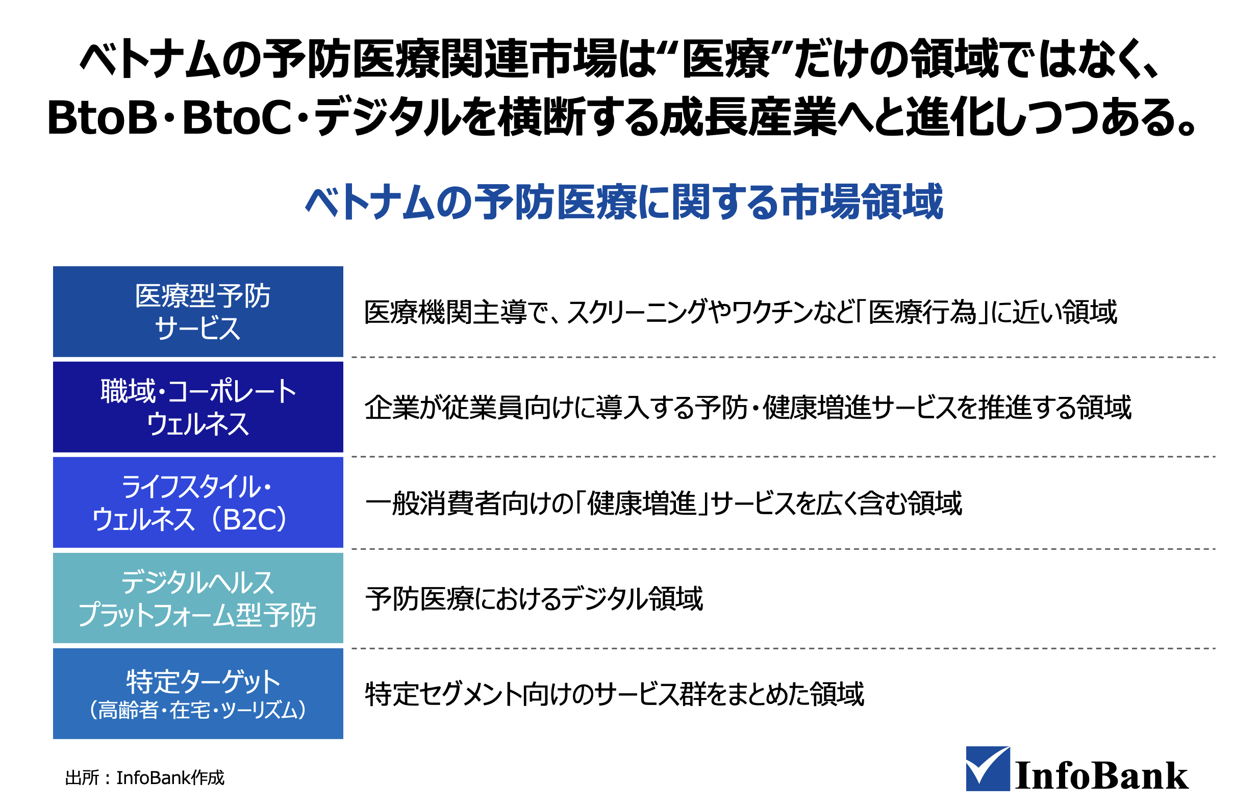 ベトナムの予防医療関連市場は、単純な「医療」だけの領域にとどまらない。健康診断やがん検診、生活習慣病予防といった医療型サービスに加え、企業向けウェルネス、一般消費者向けのフィットネスや栄養管理、さらにはデジタルヘルスや特定ターゲット(高齢者・在宅・ツーリズム)向けサービスまで、BtoB・BtoC・デジタルを横断する成長産業へと裾野が広がりつつある。