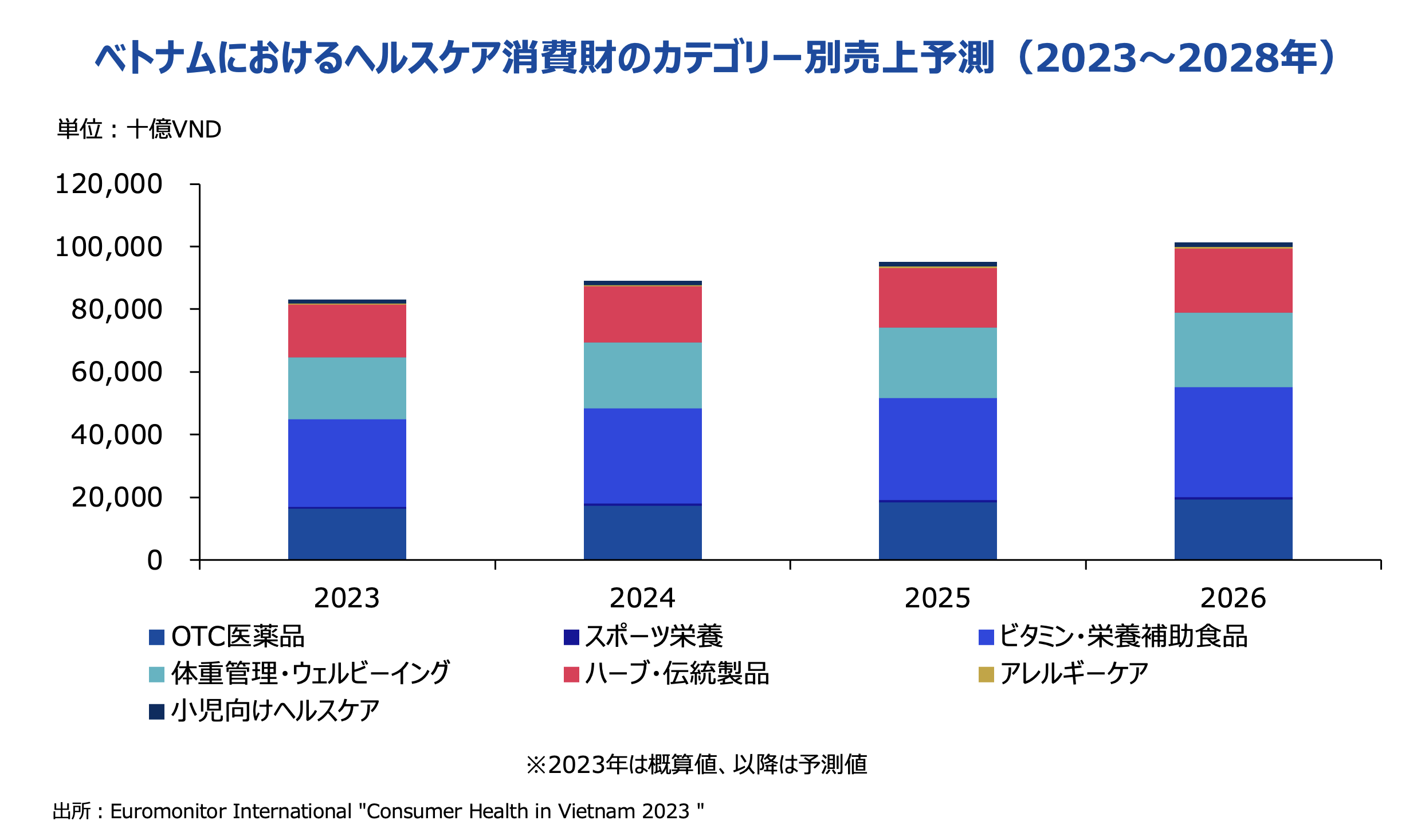 ヘルスケア消費財市場のデータも、この流れを裏づけている。ビタミン・栄養補助食品やスポーツ栄養を中心に市場は年々拡大しており、売上ベースの予測では2023年から2026年の3年間で約18,000十億VND、金額ベースで約22%の成長が見込まれている。