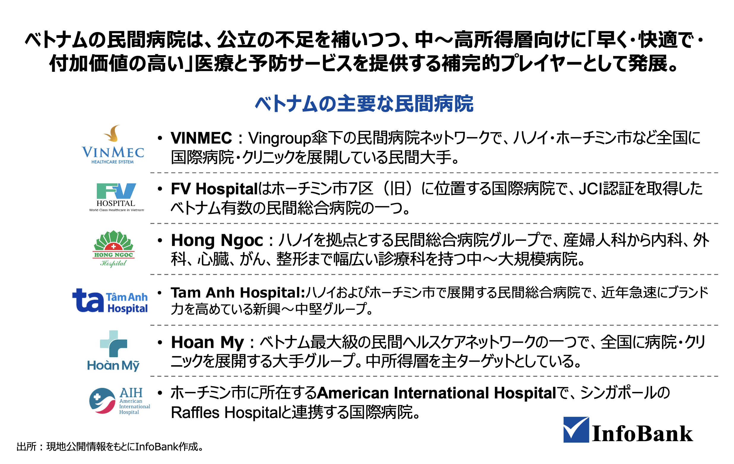 ベトナムの民間病院は、公立病院の不足を補いつつ、中〜高所得層向けに「早く・快適で・付加価値の高い」医療と予防サービスを提供する補完的プレイヤーとして着実に存在感を高めている。代表的なところでは、Vingroup傘下で全国展開するVINMEC、JCI認証を取得した国際病院のFV Hospital、高精度画像診断を武器に早期発見型の予防医療モデルを打ち出すTam Anh Hospitalなどが挙げられる。