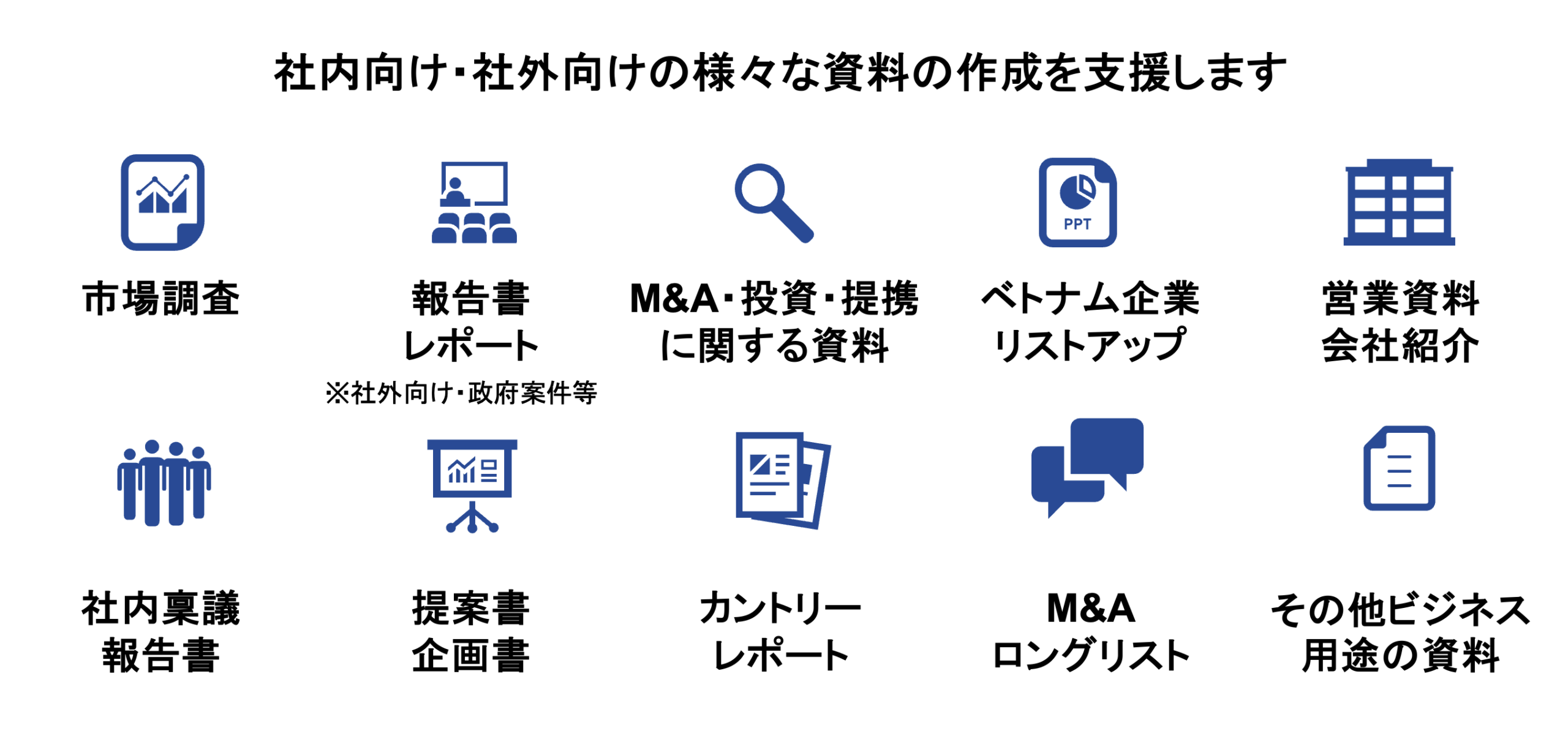 社内・社外向けのベトナムに関する資料作成やレポートの作成を代行します。