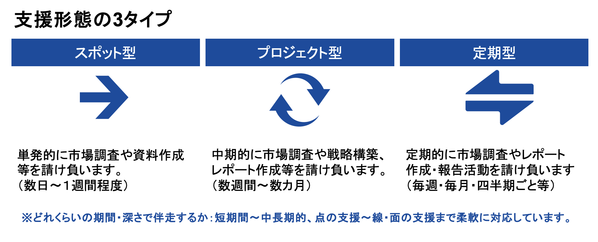 - 市場調査や資料作成などの支援を、単発・短期間で依頼できるスポット型から、中期的なプロジェクト型、継続的に伴走する定期型まで3つの形態で提供。