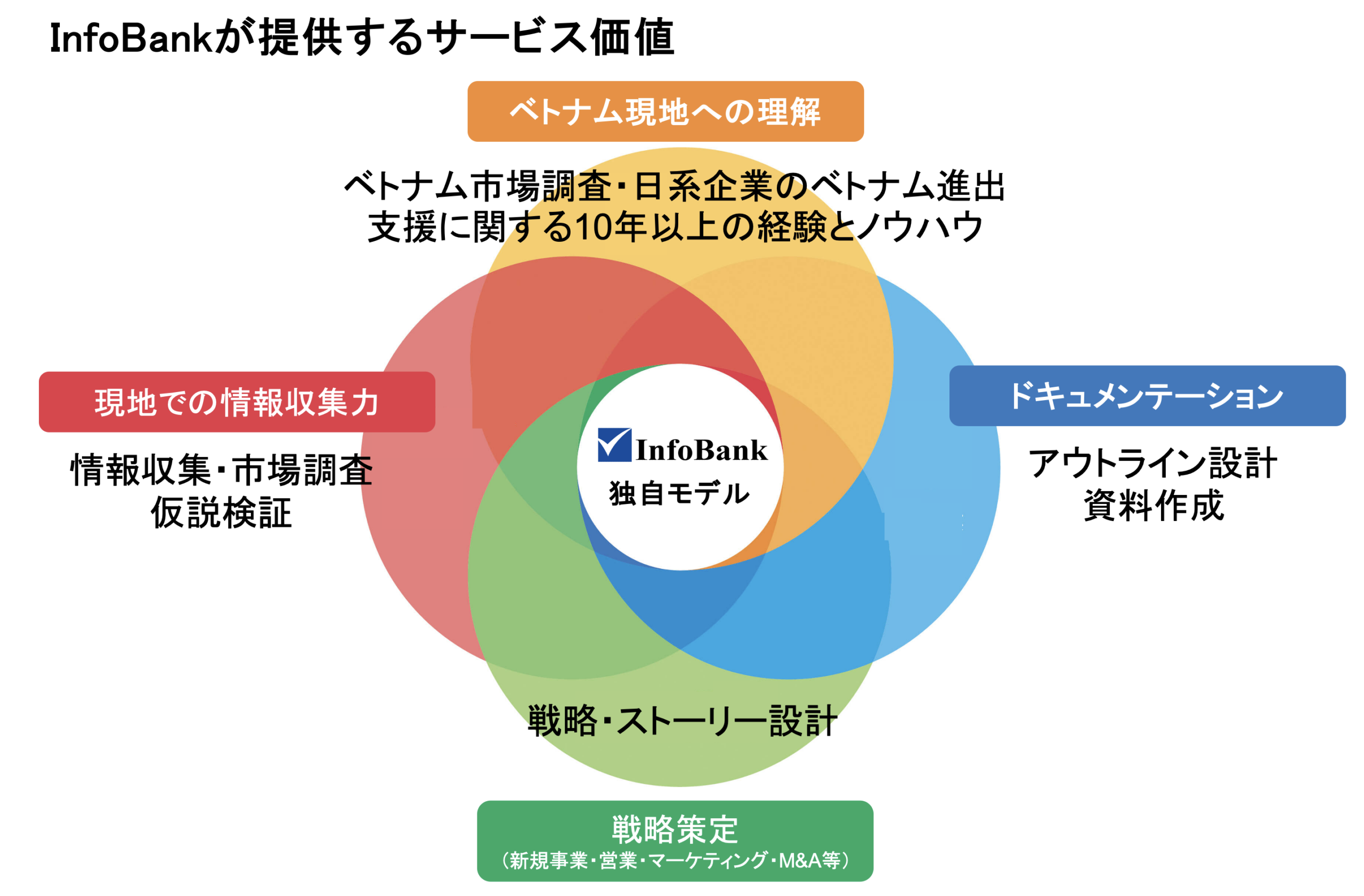 - InfoBankは、ベトナム市場に精通した現地理解と10年以上の実務経験を基盤に、市場調査・仮説検証から戦略設計、資料作成までを一気通貫で支援します。(※一部のみの依頼も可能です)