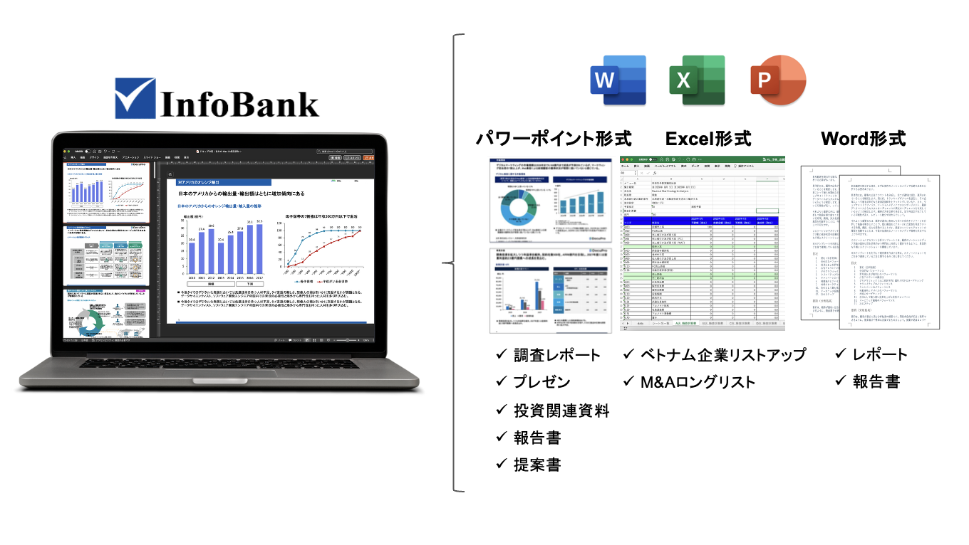 - InfoBankは社内・社外向けを問わず、ベトナムビジネスに関わる様々な資料の作成に対応しています。