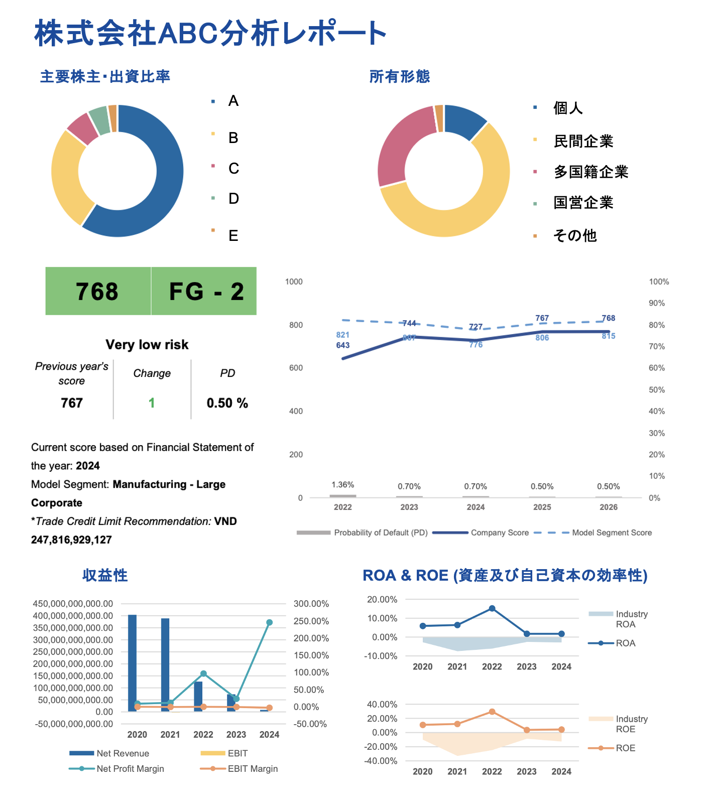特定のベトナム企業に対して、以下のような主要な情報を複数年度にわたって取得可能です。